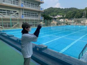 プール周りのシートがはがれていました。怪我をする恐れがあります。